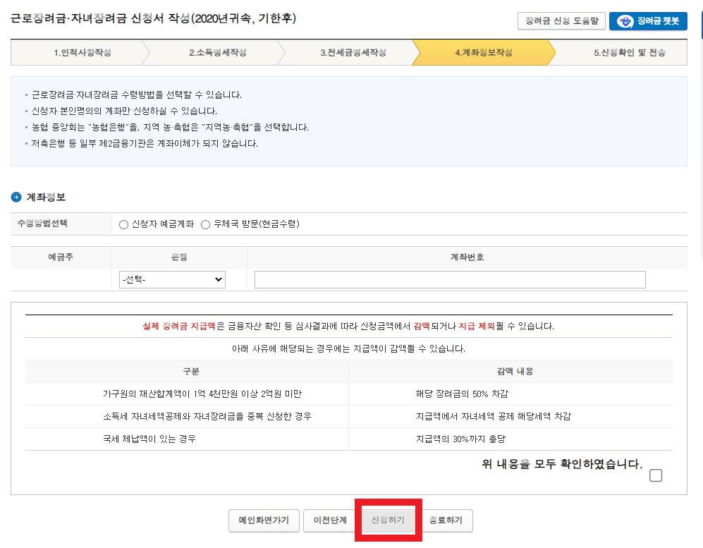 근로장려금과 자녀장려금을 받을 계좌정보를 입력합니다. 신청자 예금계좌를 등록하면 해당 계좌로 이체되오니 참고하시길 바랍니다. 실제 장려급 지급액의 경우는 심사결과에 따라 감액 또는 지급제외가 될 수 있다는 내용을 동의한 후 다음 단계로 이동합니다.
