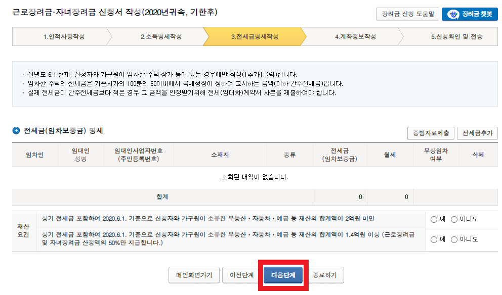 전세금 2억 미만일 경우만 해당되기 때문에 해당 내용에 체크를 한 후 다음단계로 이동하면 됩니다.