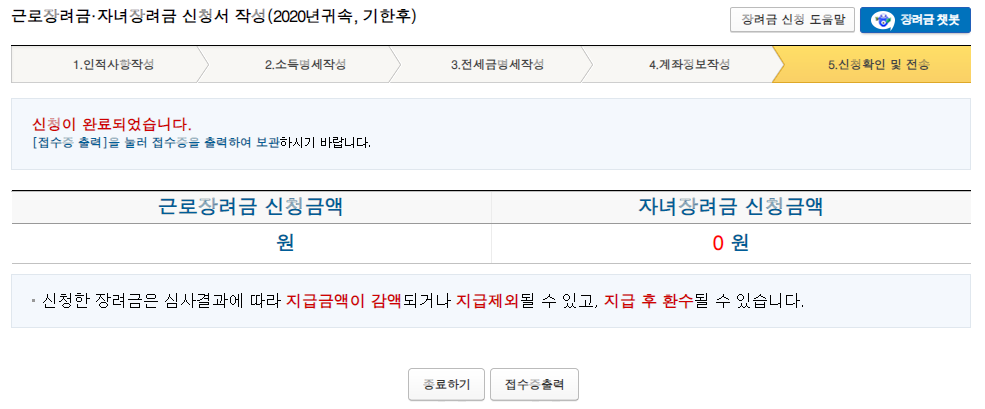 하단에 근로장려금 신청액과 자녀장려금 신청금액을 확인할 수 있게 됩니다. 모두 확인했다면 아래 종료버튼을 누르면 됩니다. 모두 놓치지 마시고 근로장려금 신청해서 모두 받아가시길 바랍니다.