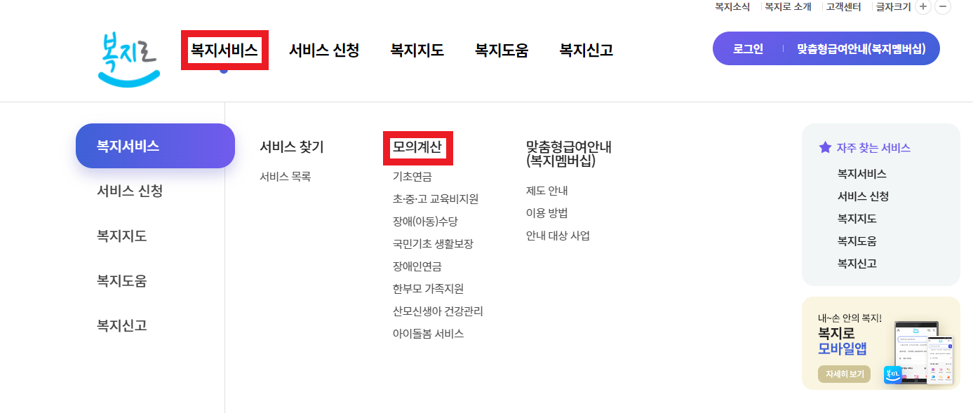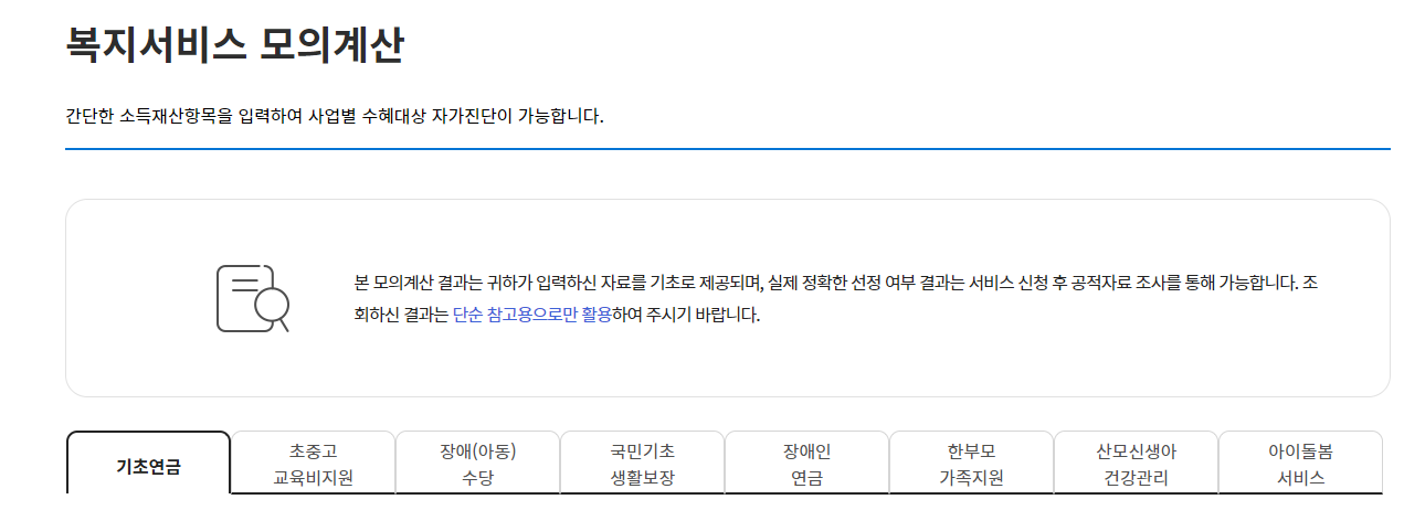 복지서비스 모의계산에 들어가면 원하는 복지서비스에 대한 모의계산이 가능합니다. 원하는 수혜대상 진단 리스트를 선택하시길 바랍니다.