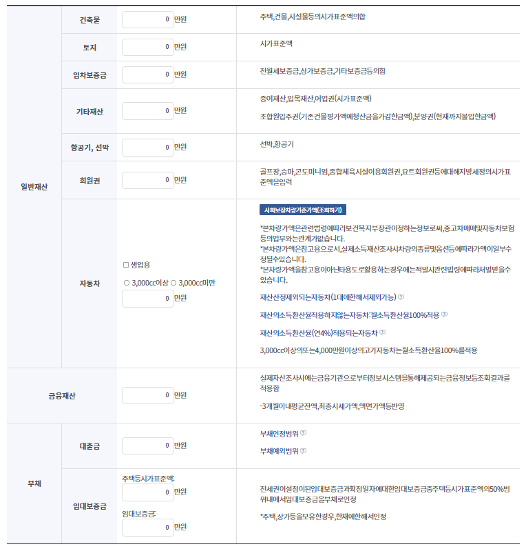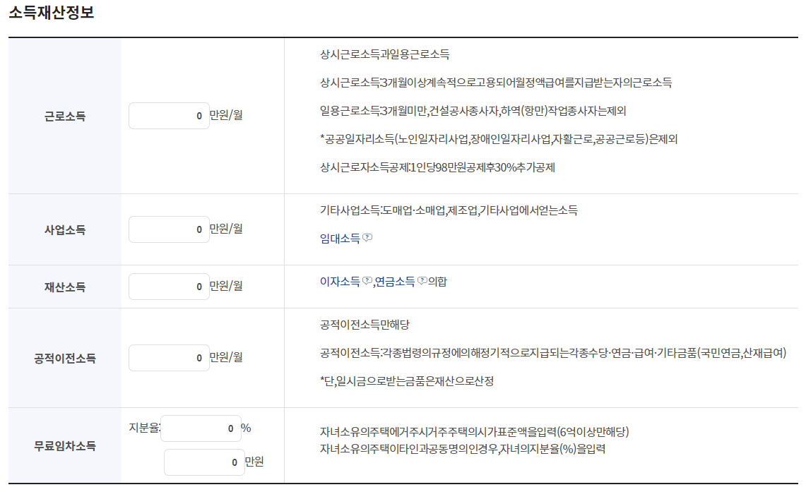 근로소득과 사업소득, 재산소득, 무료임차소득 및 금융소득 등을 기재하도록 합니다. 대출금 및 부채, 일반재산에 대한 상세한 내용들을 기재하게 되면 본인이 해당 복지 수혜대상인지 확인이 됩니다. 자세한 부분은 동사무소에 방문해서 확인하는 것이 가장 정확합니다.